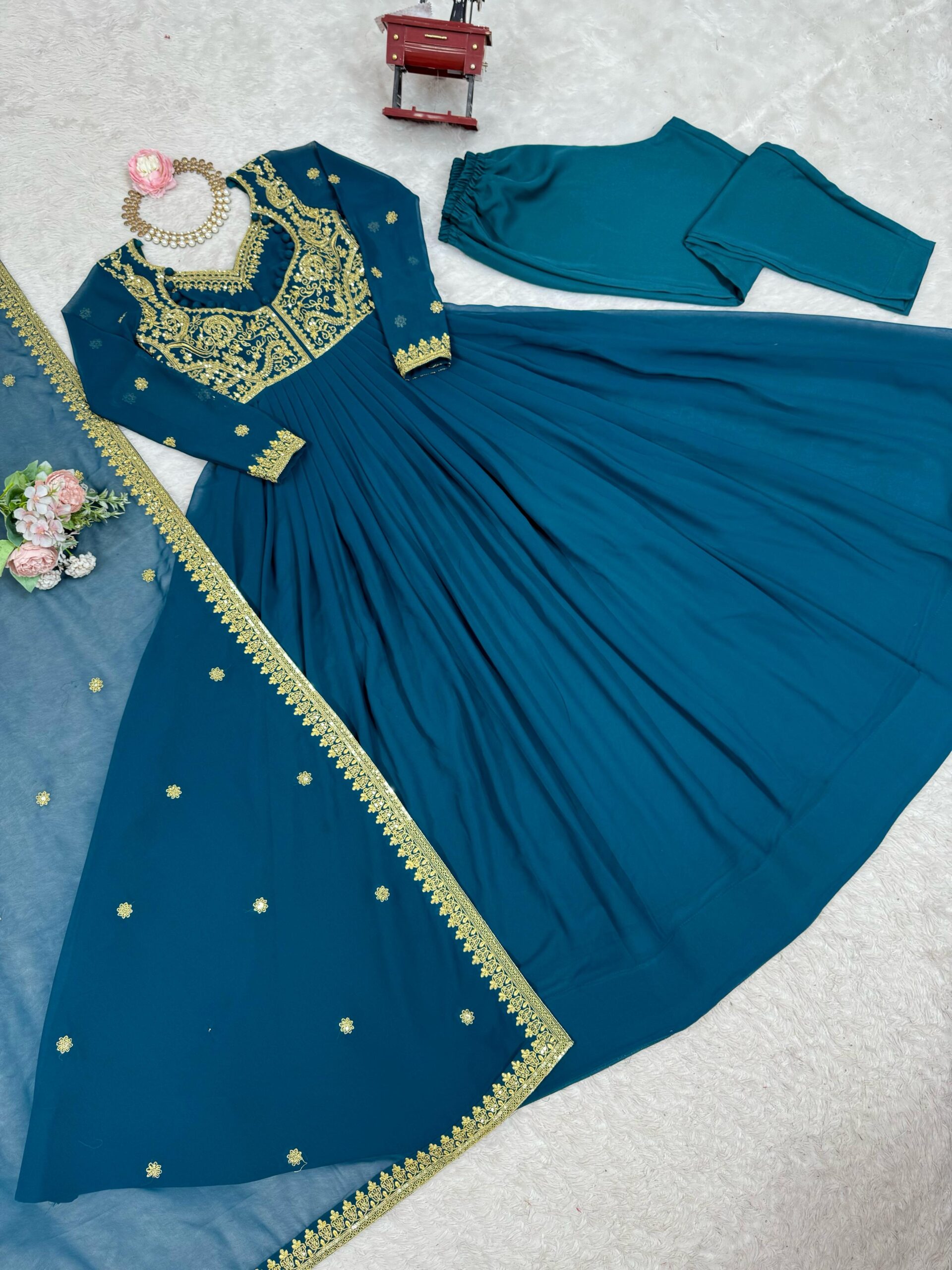 The Allure of Teal Blue Faux Georgette: Elevate Your Wardrobe with Sequence Work Suits