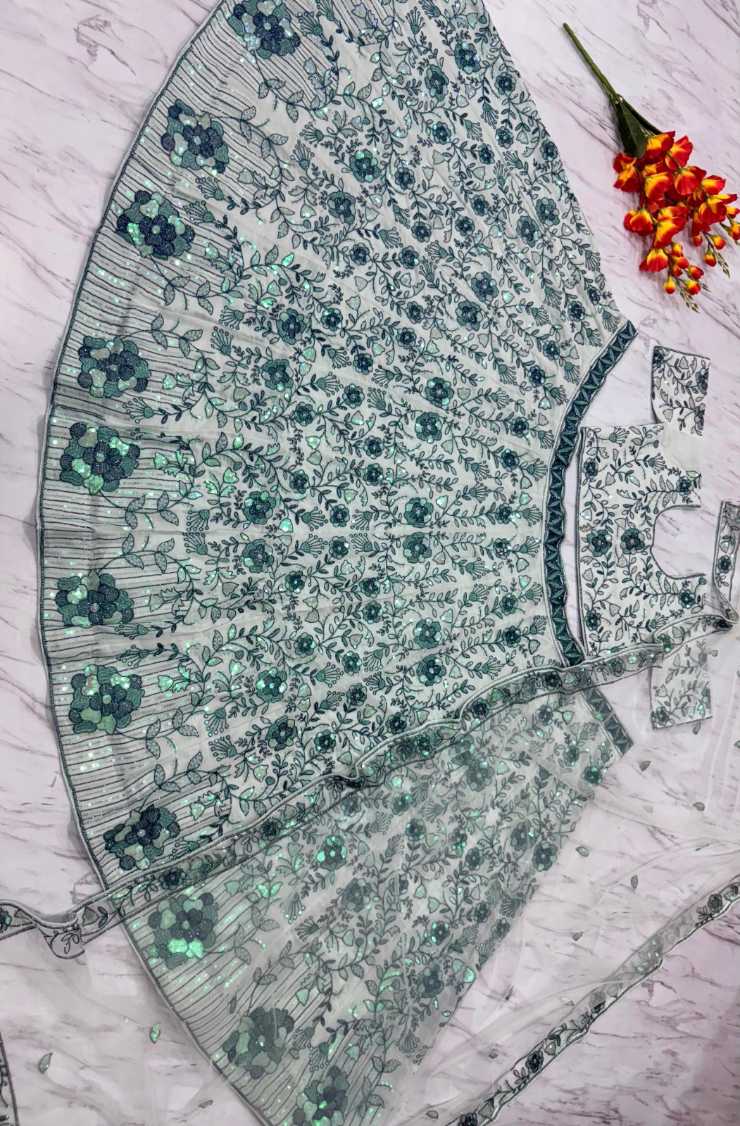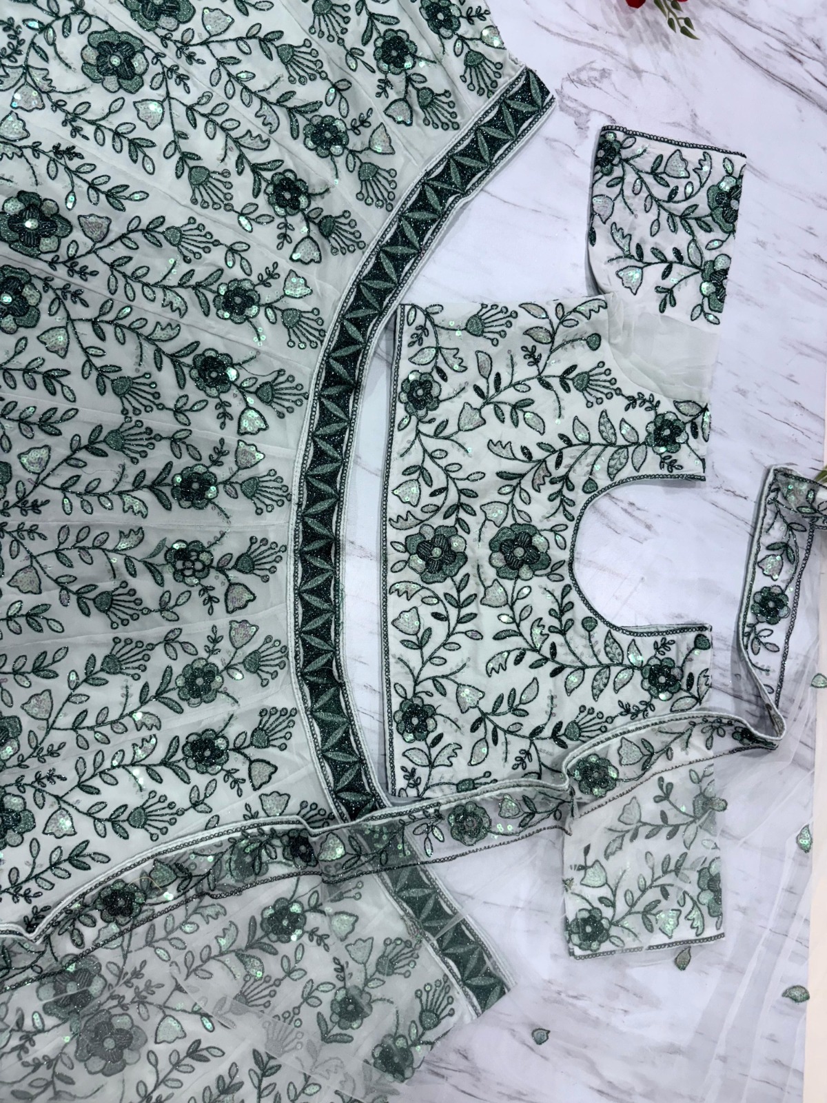 One of the most eye-catching features of the White color lehenga is the stunning Sequence Work. This detailing not only enhances the overall look but also reflects light beautifully, drawing attention to the finer aspects of the outfit. When paired with matching accessories, this lehenga can make any wearer stand out in a crowd.