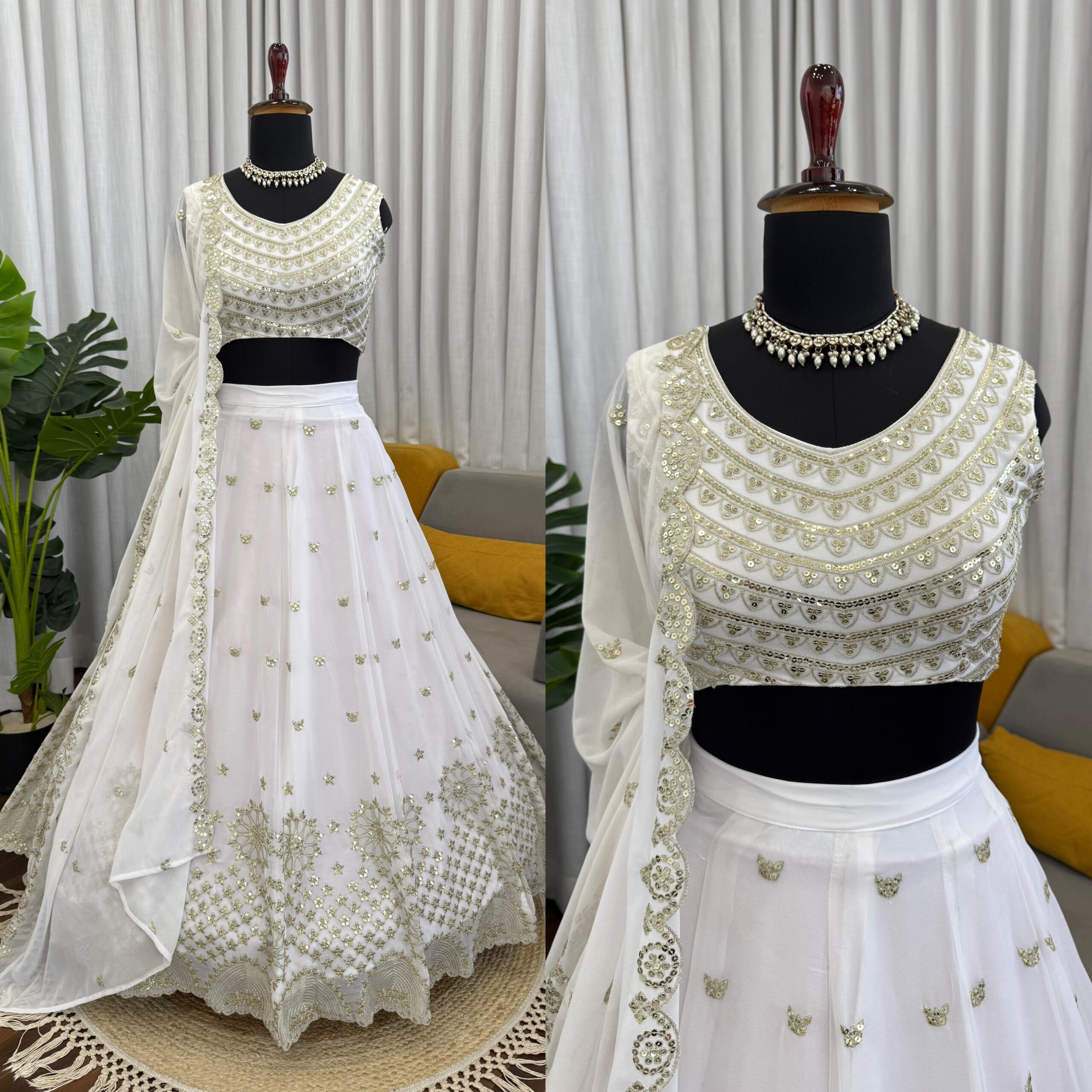 When it comes to traditional attire, the Lehenga stands out as a timeless choice. Particularly, a White color faux georgette fabric Lehenga adorned with intricate Thread With Sequence Work can elevate any occasion. This blend of modern design with traditional elegance ensures that you make a stunning impression.