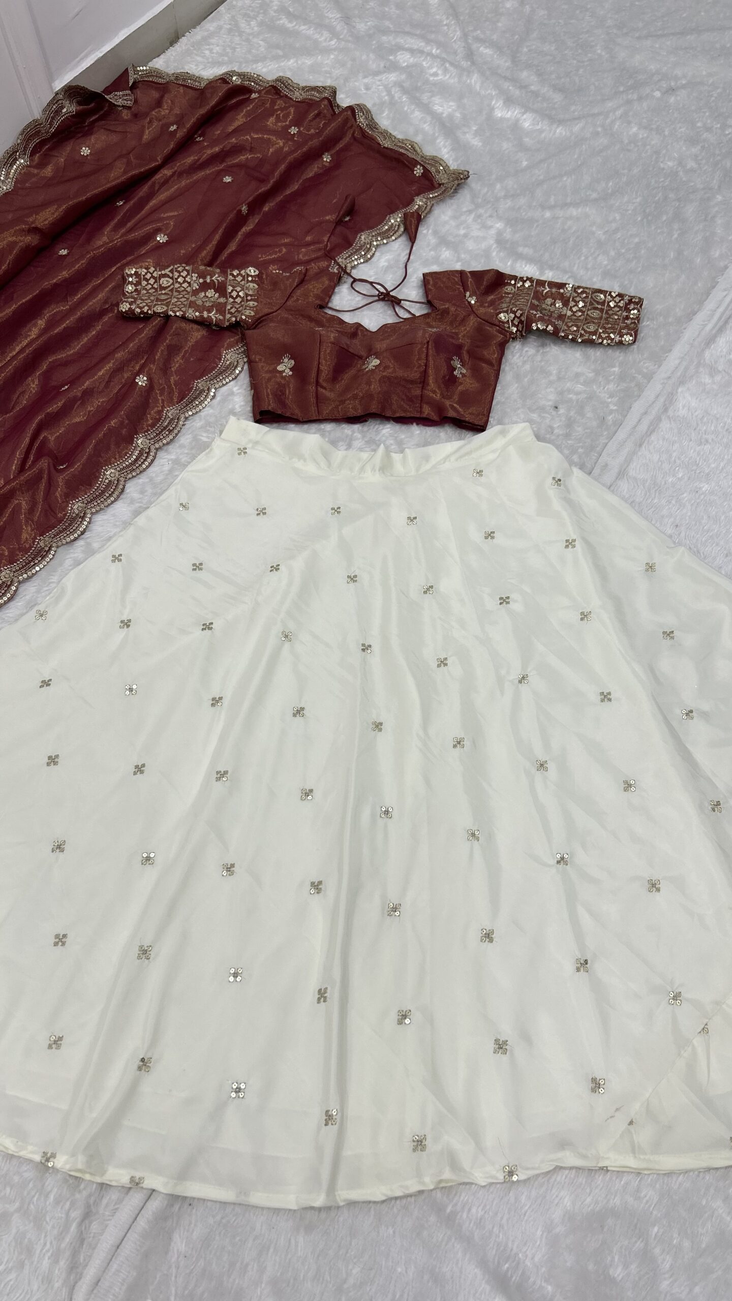 In summary, the White color Pure Crepe Silk fabric Sequence With Jari Work lehenga is a timeless piece that brings together elegance and comfort. Its intricate design and beautiful fabric make it a perfect addition to any fashionista’s collection. Celebrate your next special occasion by embracing the beauty of this stunning lehenga.