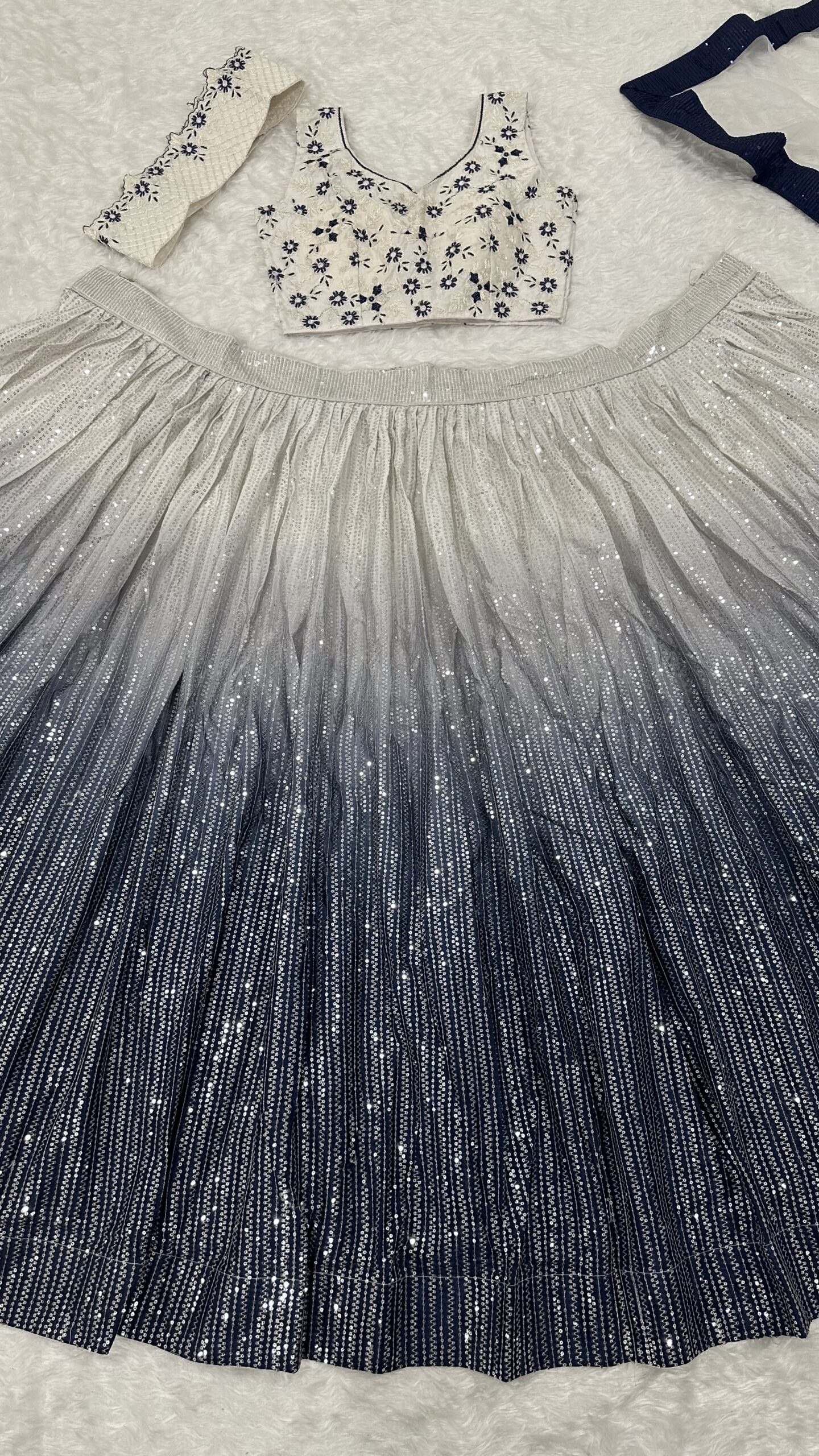 - Discover the stunning white color shaded lehenga made from georgette silk fabric, an exquisite blend of tradition and modern aesthetics. This timeless piece not only showcases intricate sequence work that beautifully reflects light but also offers comfort and elegance for any occasion.