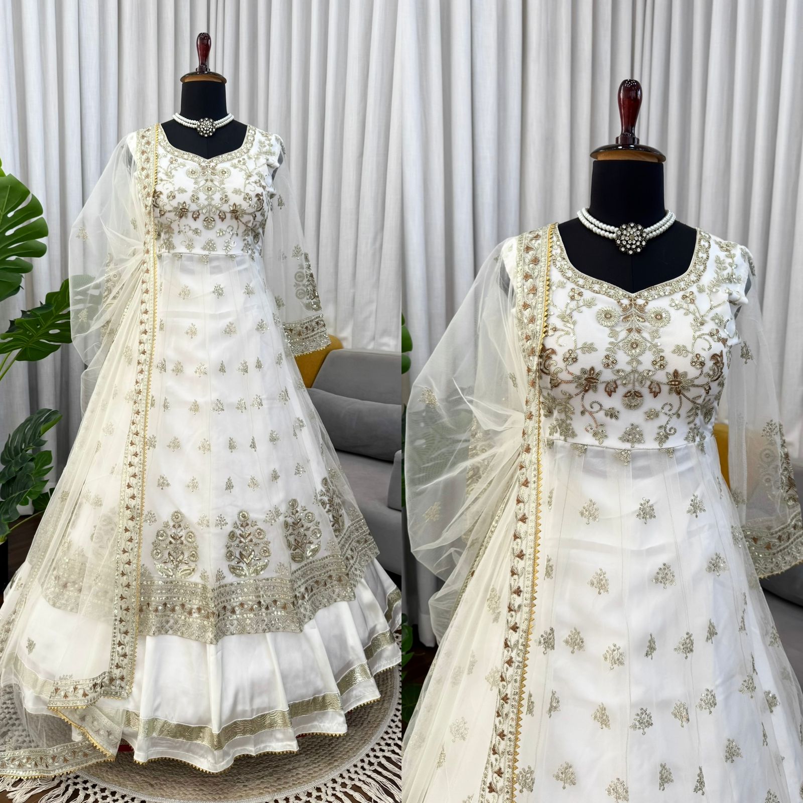 Description: The White Soft Net Lehenga Gown is a stunning and elegant outfit perfect for special occasions.