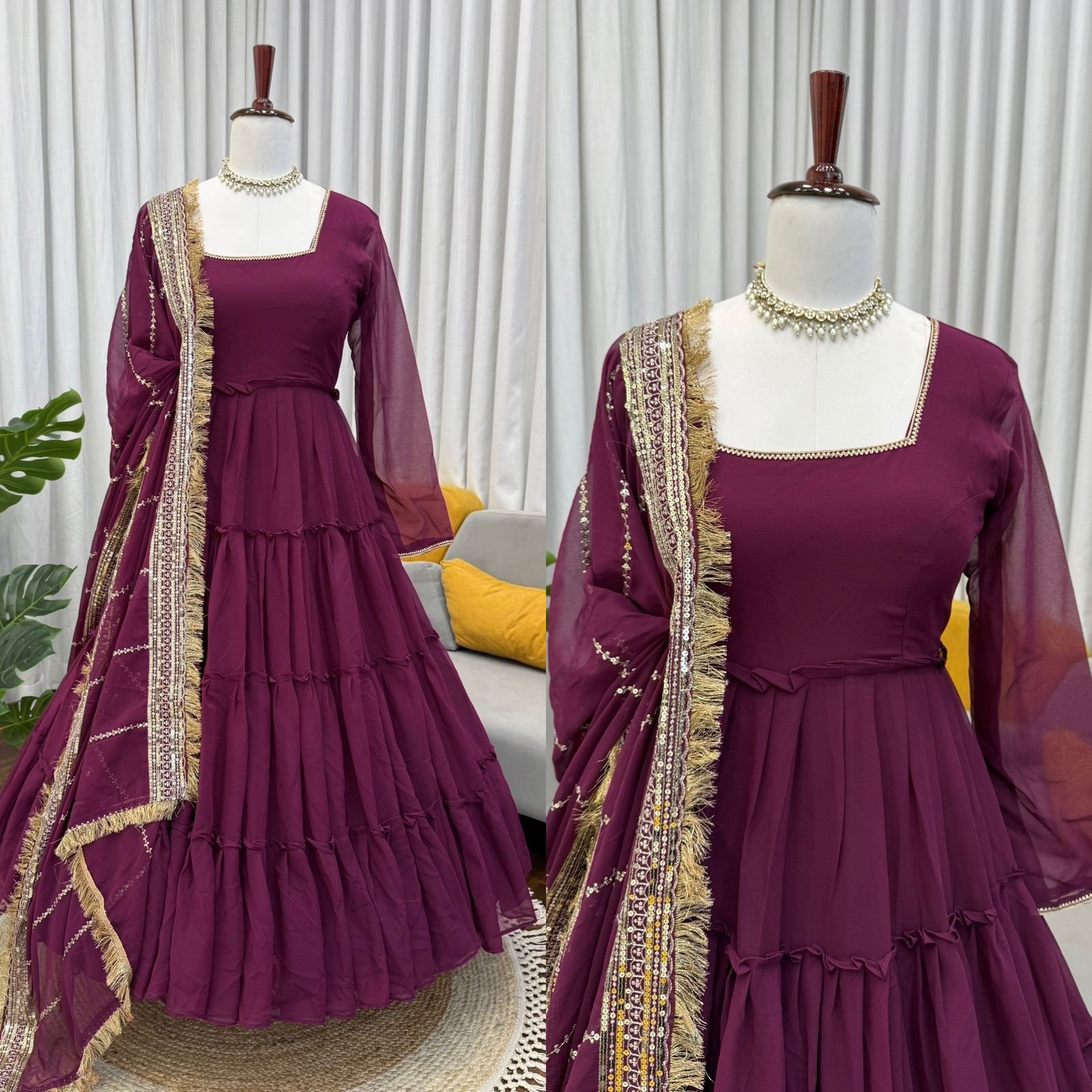 When it comes to traditional Indian attire, the Wine color stands out as a symbol of elegance and sophistication. A Wine faux georgette fabric anarkali suit captures the rich hues and intricate designs that are synonymous with Indian culture. This fabric drapes beautifully, enhancing the overall silhouette, making it a popular choice for various occasions.