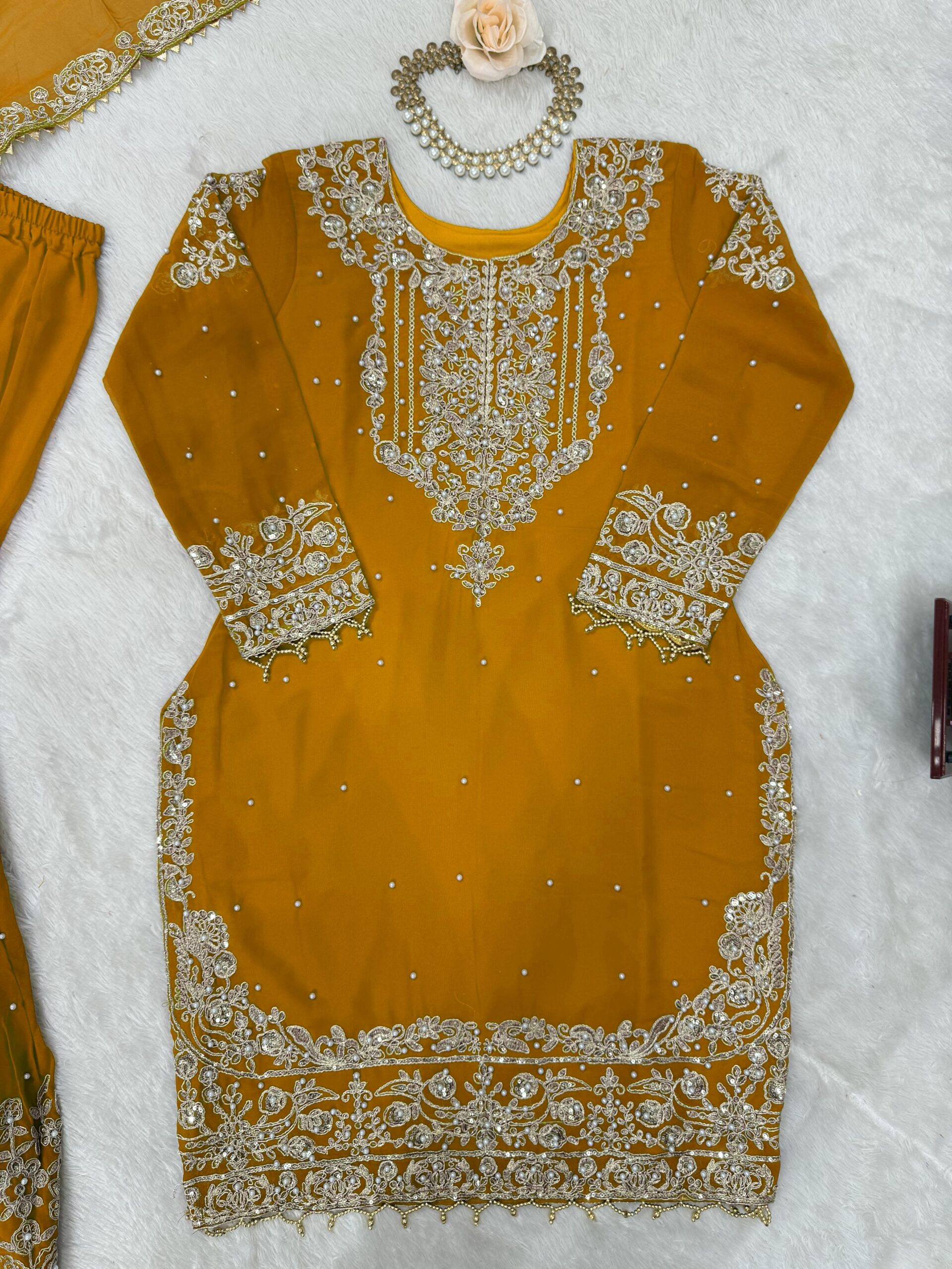 Styling your Yellow color faux georgette fabric Pearl Work Sharara Set can be both fun and creative. Pair it with statement jewelry that complements the pearl work for an elegant touch.