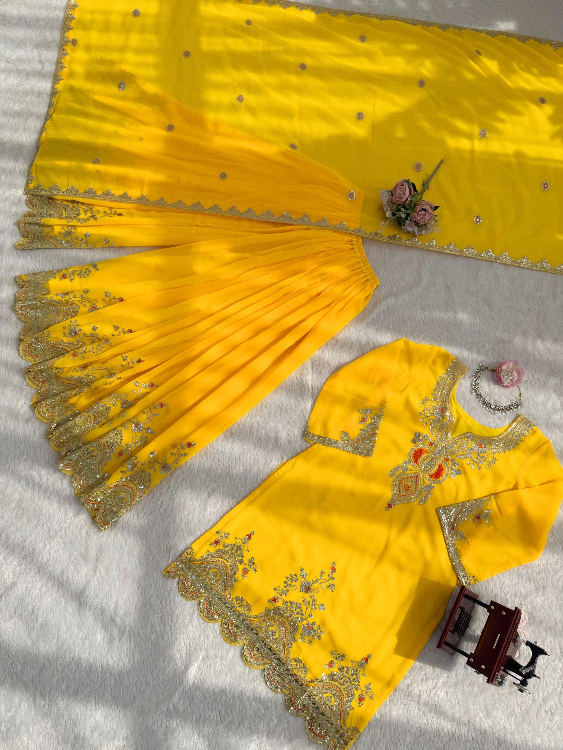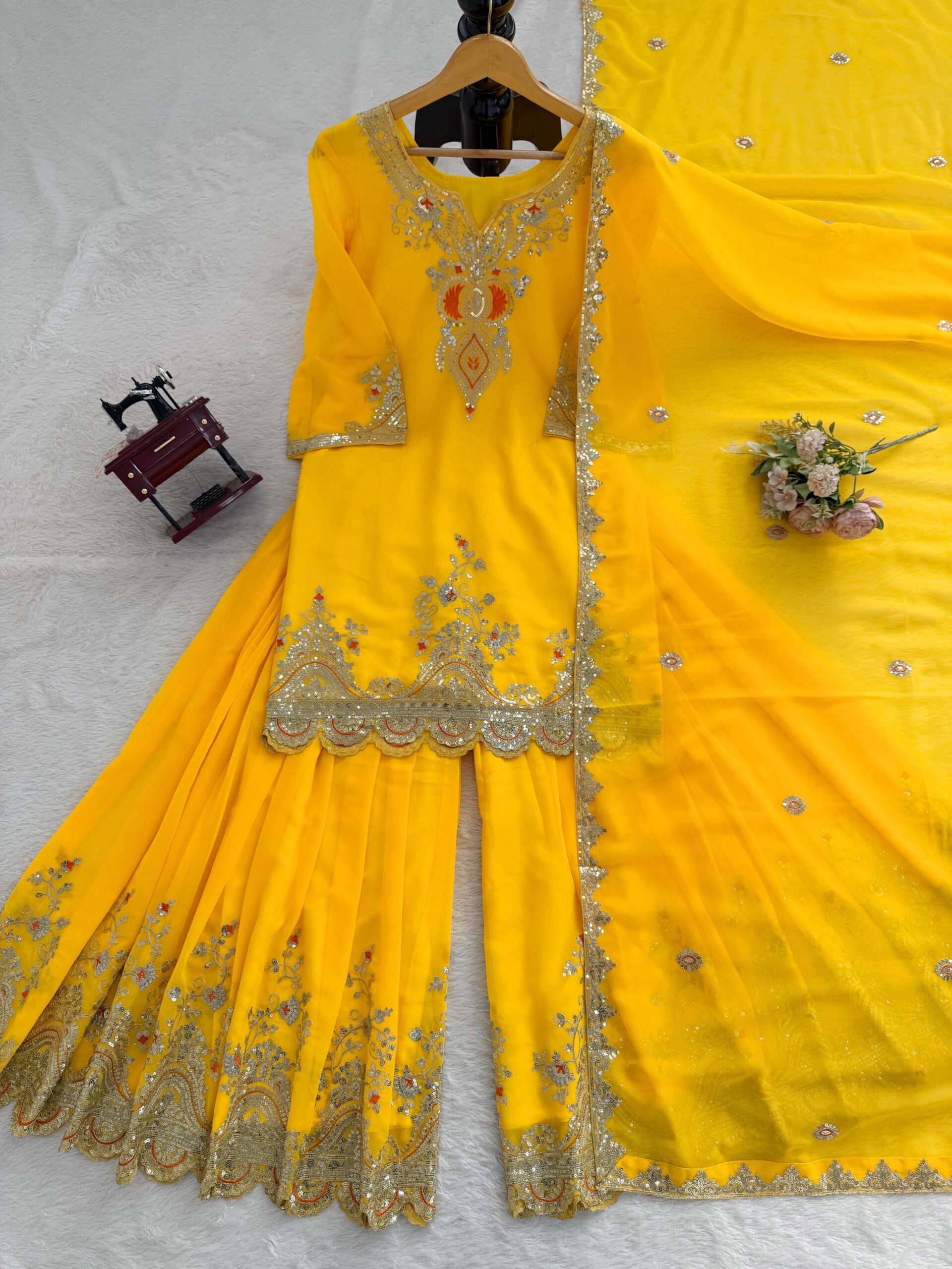 - Explore the elegance of the Yellow faux georgette sharara set, a beautiful fusion of traditional and modern fashion. This outfit features intricate Sequence Work and a lightweight feel, making it ideal for festive occasions.